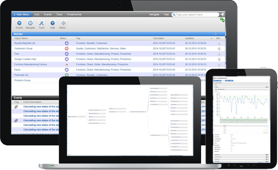 The virtual enterprise model runs on the engine in cloud or locally in-house. All its components are installed and updated automatically without need for technical support. Authorized users can view the enterprise events and processes anytime and from anyplace.
