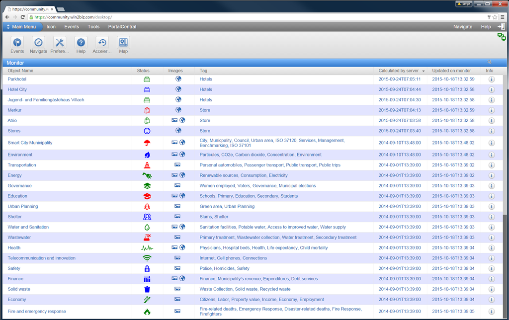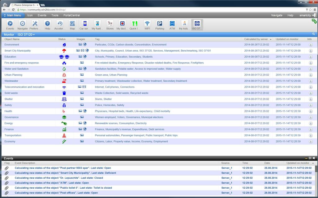 After a click on the Monitor toolbar icon ISO31720, the dashboard presents only the objects that are included into Smart City ISO 37120 Model as theme-objects to simplify the monitoring, benchmarking and analysis of a city accordingly to the Standard.