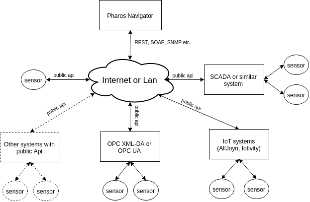 The overall generic structure of PharosN optional linkages to heterogeneous IoT environment is illustrated by the following diagram.